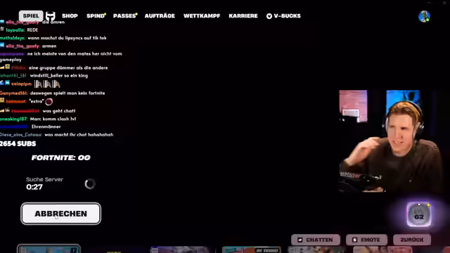 00:16:33Nach der Ankündigung, Fortnite zu spielen, um Zeit mit der Community zu verbringen – was er betont, aus reinem Interesse an der Interaktion, nicht aus Spaß am Spiel –, beginnt ein Session von Random Duos. Der Streamer spielt mit verschiedenen Partnern, von denen er sich distanziert, da sie ihm spielerisch unterlegen erscheinen. Die Unterhaltung wechselt häufig zwischen Gameplay und politisch aufgeladenen, humorvollen Dialogen. Dabei vergleicht er das Bauen von Deckungen in Fortnite mit Vorbereitungen auf einen Kriegsdienst und erörtert Themen wie die Wehrpflicht, die AfD ("Leber-Deutschland") und den Rechtsruck in verschiedenen Bundesländern.