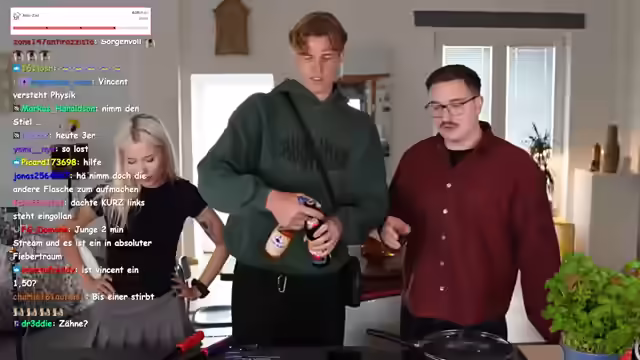 00:14:00Es gibt Schwierigkeiten beim Öffnen einer Flasche, was zu humorvollen Komplikationen führt. Zunächst wird versucht, die Flasche mit unkonventionellen Methoden zu öffnen, was jedoch misslingt und fast zu Beschädigungen führt. Dann wird eine Zange geholt, um den Kronkorken zu entfernen. Es folgen weitere Versuche, die Flasche zu öffnen, begleitet von lustigen Kommentaren und Anfeuerungsrufen. Schließlich gelingt es, die Flasche zu öffnen, was mit Erleichterung und Jubel gefeiert wird. Der Chat wird aktiv in den Prozess einbezogen, und es entsteht eine interaktive und unterhaltsame Atmosphäre. Die Szene zeigt auf humorvolle Weise die Herausforderungen des Kochens und die Bedeutung von Teamwork und Durchhaltevermögen.