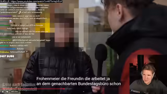 01:52:10Der Fokus lag auf einem Clip aus dem ZDF, der eine Konfrontation zwischen einer rechten Demonstrantin und einer Gegendemonstrantin zeigte. Während der Streamer die Demonstration als rechtmäßiges Recht verteidigte, kritisierte er die massiven Polizeiaufgebote und die Ausschreitungen. Er zitierte die Aussage der rechten Demonstrantin, das deutsche Volk sei ein 'tiefgründiges, romantisches Volk', und bewertete diese Aussage als inhaltsleeres Geschwafel. Der Clip spiegelte für ihn die gespaltene und polarisierte Gesellschaft wider.