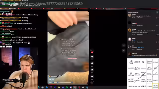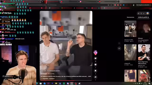 00:08:52Der Fokus verschiebt sich auf die Analyse von TikTok-Inhalten, insbesondere sogenannter "Nazi-TikToks". Der Streamer zeigt private Likes, distanziert sich aber vorab von den Inhalten. Er diskutiert mit dem Chat über markante Algorithmen-Empfehlungen (z. B. "Fußbilder") und stellt verschiedene TikTok-Videos vor, darunter musikalische Beiträge und eigenartige Trends. Dabei kommentiert er auch politische Äußerungen in den Videos, wie Aussagen zu Parteien oder gesellschaftlichen Themen.