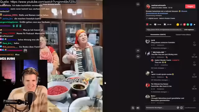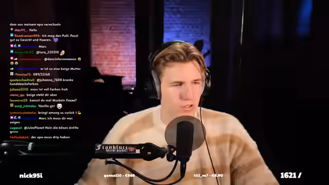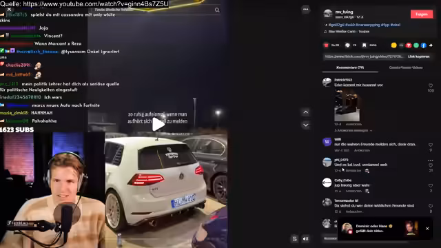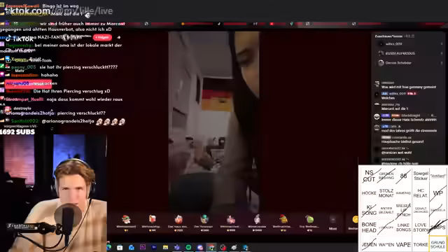 02:43:28Der Streamer zeigt diverse TikToks, darunter eine Person, die Hitlergrüße sendet, und eine Gruppe, die sich 'Neuer Widerstand Deutschland' nennt. Er interagiert mit rechten Kommentaren, kritisiert Simpen undعناية. Diskussionen über Sachsen als rechtsextreme Region, KI-Bilder und technische Probleme wie ein verschlucktes Piercing unterbrechen den Stream. Ein Raid von LeFloid begrüßt neue Zuschauer.