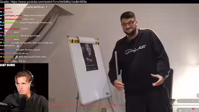 00:03:28Der Stream beginnt mit technischen Anpassungen und der Begrüßung des Chats. Im Mittelpunkt steht ein politisches Gespräch zwischen dem Streamer und einem 14-jährigen Chat-Teilnehmer namens Graf. Der Graf identifiziert sich als rechts, erwähnt seine Mitgliedschaft in der ehemaligen Jungen Alternative und die Auflösung des AfD-Kreisverbands. Es wird eine Debatte über das System der parlamentarischen Demokratie entfacht, bei der der Graf die Abschaffung von Parlamenten zugunsten von Volksabstimmungen fordert.