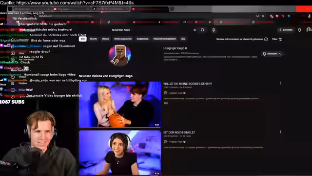00:44:31Nachdem die inhaltliche Diskussion stockt, fokussiert sich der Stream auf die Analyse der medialen Wirkung des Streamers. Es wird ein Clip des sogenannten 'Hunger-Hugo'-Videos besprochen, in dem der Streamer prominent auftritt und in den Kommentaren stark im Mittelpunkt steht. Der Streamer selbst reflektiert seinen anerkannten 'Fame'-Status, kritisiert aber gleichzeitig die damit einhergehende negative Aufmerksamkeit und seinen bevorstehenden 'Downfall' im Kontext eigener Inhalte.