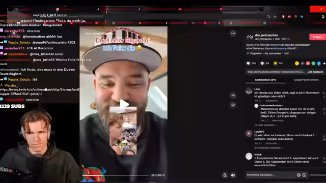 01:01:00Der Streamer reflektiert über die überwältigende Resonanz auf seine Videos, insbesondere die Kommentare, die sich fast ausschließlich auf ihn beziehen. Er erwähnt, dass er seit dem ersten Teil des AfD-Sommerfests an Bekanntheit gewonnen hat, befürchtet jedoch, dass sein 'Downfall' bevorsteht. Das neueste Video, 'Ich habe das AfD-Sommerfest eingenommen, Teil 2 von 4', hat nach drei Stunden bereits 51.000 Aufrufe erzielt, was er als '2 von 10' bewertet. Anschließend schaut er sich mit den Zuschauern die Outtakes des Videos an und lobt die aufwendigen Animationen und Edits seines Cutters, besonders die Darstellung von Ulrich Siegmund mit wechselnden Artikeln. Er beschreibt die Herausforderung, während der Dreharbeiten ernst zu bleiben, besonders nach einem Ball gegen den Kopf.