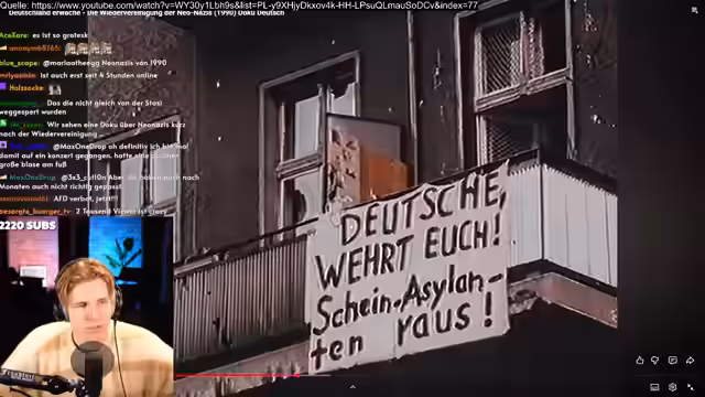 02:57:56Die Doku beschreibt die Situation in Spremberg, wo Asylbewerber aus Rumänien und Bulgarien eine neue Zukunft suchten. Eine Frau äußert ihren Wunsch, nach Deutschland zu kommen, um Not und Elend zu entkommen. Die Stadt wird als 21.000 bis 22.000 Einwohner stark beschrieben. Ein Ehemann der Frau, Sven Grimm, gehört zur Kameradschaft Spremberg. Die Doku zeigt, dass die Stadt in den frühen 90ern mit einem starken rechtsextremen Umfeld konfrontiert war, das gegen Ausländer gerichtet war. Der Streamer reflektiert über die damaligen Ängste und die Ablehnung gegenüber Fremden.