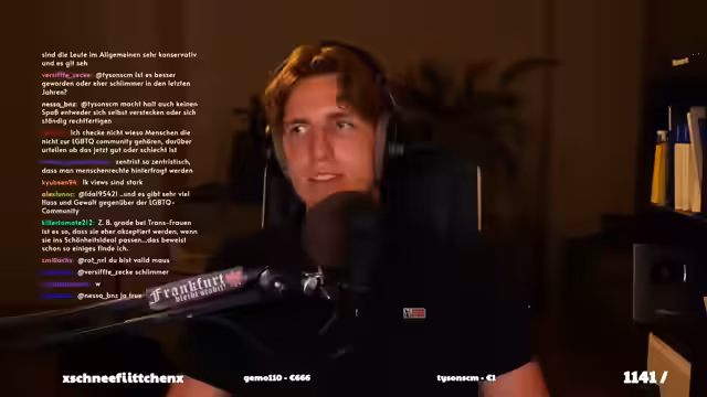 00:21:11Es wird die Ablehnung von Interviews durch CSD-Gegner thematisiert und die Frage aufgeworfen, ob man Personen filmen darf, die ein Interview ablehnen. Ein Neonazi-Dasein und der Paragraph 23 KUG werden angesprochen. Es wird positiv hervorgehoben, dass ein CSD-Gegner nicht mehr mit einem Auto mit Combat 18 Sticker herumfährt. Combat 18 wird als Rechtsterrorismus und Militanz auf Endlevel eingestuft. Es wird die Frage nach den Gründen für die Teilnahme an der Demonstration gestellt und das Leid eines Teilnehmers in Bomberjacke thematisiert. Ein Vater, der sich schützend vor seinen Sohn stellt, wird als heldenhaft dargestellt. Die totalitäre Art, Interviews zu verhindern, wird kritisiert. Es wird die Frage aufgeworfen, warum Menschen Interviews verhindern, wenn sie von ihrer Meinung überzeugt sind. Es wird ein Kommentar von Jay erwähnt, der eine Einordnung des CSD fordert.