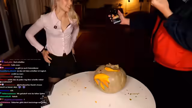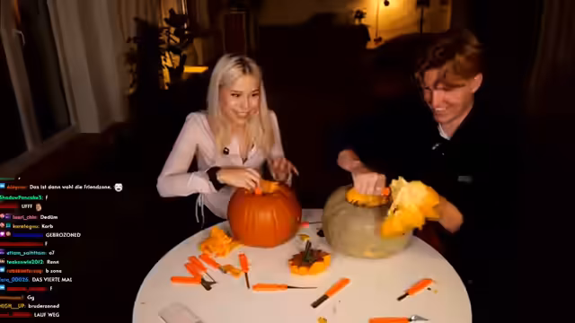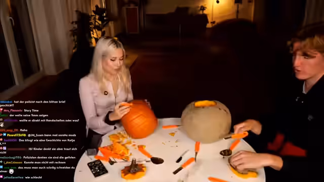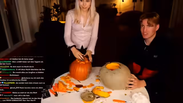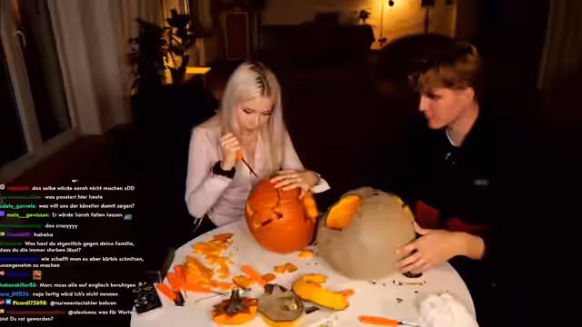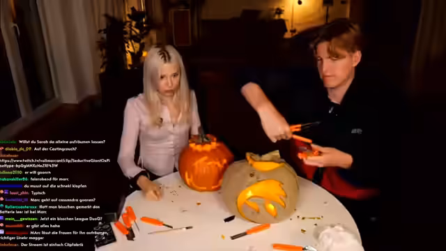 00:02:49Hauptthema des Streams ist das gemeinsame Kürbisschnitzen, bei dem die beiden in eine heftige Diskussion über die korrekte Technik geraten. Marc wirft Sarah vor, falsch zu arbeiten und nur auf Schnelligkeit zu bedacht, während sie seine Methode kritisiert. Zwischen den Auseinandersetzungen tauchen persönliche Themen auf, so erzählt Sarah von einem unangenehmen Date mit einem Polizisten, der eine Vorliebe für Handschellen hatte. Es folgen Diskussionen über Körpergröße, Geburten, insbesondere Kaiserschnitte, und die allgemeinen Unterschiede in den Chats von beiden Streamern.