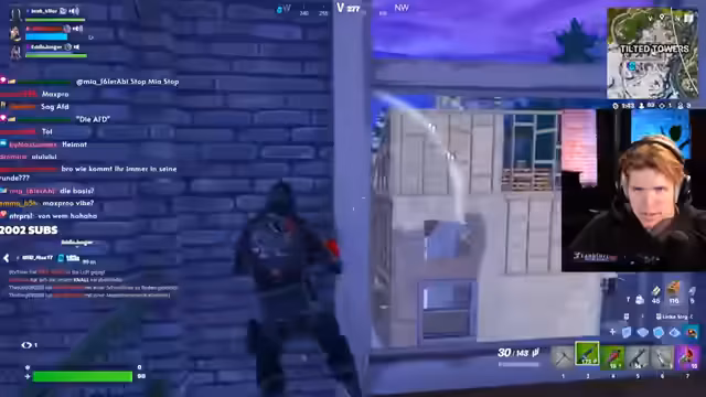 02:02:07Es wird das Ziel geäußert, bis zum Ende des Streams 2026 Subs zu erreichen und der Streamer äußert, dass er den Hate nicht versteht. Später kommt es zu einem Streit im Chat, bei dem ein Nutzer 'Niklas' mit der AfD in Verbindung gebracht wird. Der Streamer fordert den Nutzer auf, in den Discord zu kommen, und schlägt ein 1-gegen-1 Fortnite-Duell vor, über dessen Ausgang die politische Wahlentscheidung des Verlierers stehen soll.