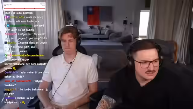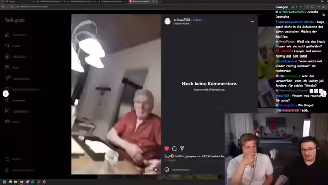 00:54:22Nach einem Disput über Beziehungen wird ein zukünftiger gemeinsamer Kampf-Sport-Stream angedeutet. Der Gast offenbart, dass sein Bekannter, Dan Odin Wölfer, ihn töten will. Der Streamer hingegen fühlt sich sicher, da Wölfer in seiner Instagram-Story geschrieben habe, er werde sein Gesicht nicht mehr anschauen. Dies wird als Beweis dafür gesehen, dass Wölfer tief in seinem Kopf lebt, auch wenn er das Gegenteil behauptet. Die Einordnung der Person als 'Oma-Kampenberager' rundet die persönliche Konfrontierung ab.