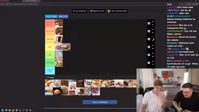 00:21:58Der Streamer schlägt ein Kuchen-Ranking vor, bei dem er und sein Gast jeweils eine Top-5-Liste erstellen sollen. Der Chat entscheidet, welche Liste besser ist. Während des Wettbewerbs kommt es zu hitzigen Debatten über verschiedene Kuchensorten wie Zwetschgenkuchen, der als 'Innovation des ostdeutschen Volksmannes' hochgehalten wird, und Benjamin Blümchentorte, die als 'Arsch' abgestempelt wird. Die Auseinandersetzung unterstreicht die unterschiedlichen Vorlieben und die Komplexität kulinarischer Vorlieben.