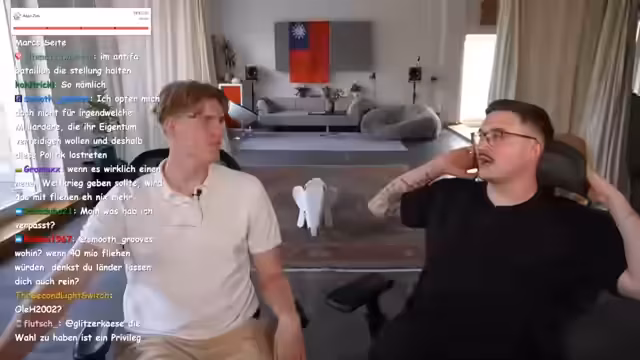 00:11:59Der Stream beginnt mit einer Diskussion über fahrene Fahrzeuge wie Trabis und Simsons, wobei ein Fokus auf ostdeutscher Kultur und einem Humor gelegt wird, der als 'based' beschrieben wird. Die anschließende Konversation drehen sich um Kleidungsstil und ästhetische Aspekte. So wird Marks Outfit als 'low-key JN-Vibes' eingestuft und sein Tattoo eines Adlers vorgestellt, das stilistisch als 'krass' bezeichnet wird. Gleichzeitig werden die beruflichen Konsequenzen von sichtbaren Tattoos thematisiert, was zu einer philosophischen Auseinandersetzung über das Berufsleben und die Rolle als Streamer führt.