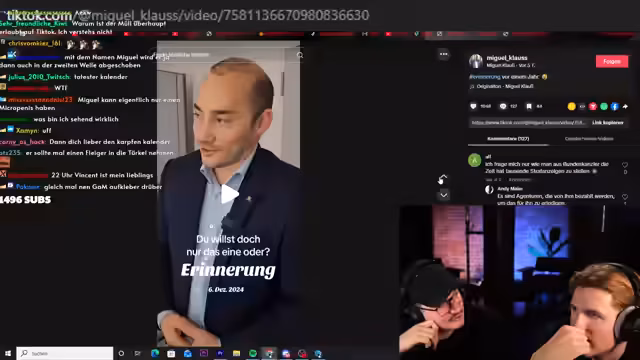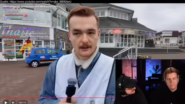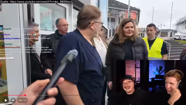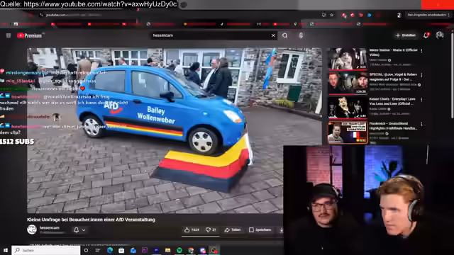 03:55:08Gemeinsam mit Vincent reagiert der Streamer auf einen AfD-Twingo, den sie als reaktionäres Symbol karikieren. Sie entwickeln satirische Ideen wie Deutschlandfahnen an allen Fenstern und schwarze Sonnen-Felgen, um die Partei zu persiflieren. Diese Ironisierung dient als politischer Kommentar zur AfD-Ideologie und ihrer Symbolik, während die beiden Streamer die Gelegenheit nutzen, um Spendengelder für ihre Kanäle zu sammeln.