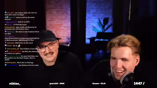 01:22:41Das Bild wird nach langer Mühe erfolgreich aufgehängt, doch die Meinungen über das Ergebnis gehen stark auseinander. Der Streamer ist anfangs begeistert und nennt es 'totarsch' (toll), doch sein Partner kritisiert sofort die Position: Der Rahmen sei breiter als die Säule, wodurch es schief und unharmonisch wirkt. Sie simulieren ein Podcast-Setup, bei dem das Bild als Hintergrund dienen soll, und debattieren über die Ästhetik. Der Partner bleibt hartnäckig bei seiner negativen Bewertung, während der Streamer versucht, mit LED-Beleuchtung nachzubessern.