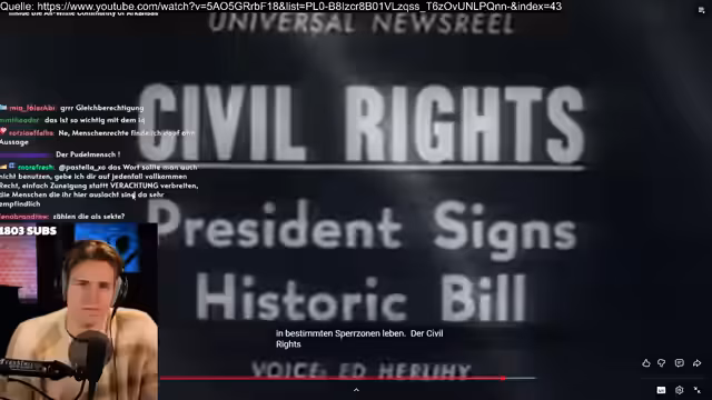 03:31:02Die Dokumentation zeigt die Rechtfertigung von Sklaverei durch den Verweis auf andere Kulturen. Der Streamer kritisiert diese Argumentation scharf und bezeichnet sie als falsche Gleichsetzung. Anschließend geht es um die Debatte um den Civil Rights Act in den USA. Er analysiert die Behauptung des Siedlers, weiße Amerikaner seien Opfer dieses Gesetzes, und identifiziert dies als die 'Mir geht's schlecht als weißer Mann'-Mentalität, die auf Opferrollen basiert.