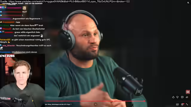 01:19:06Der Streamer wendet sich dem Thema Kampfsport zu und kritisiert, dass dieser ein signifikantes Nazi-Problem habe, das von der Szene zu wenig bekämpft werde. Im Fokus steht dann der MMA-Kämpfer Christian Jungwirth, der offen bekennen hat, ein Rudolf-Hess-Tattoo getragen zu haben, das er später aus pragmatischen Gründen überdecken ließ. Dies ist Ausgangspunkt für eine Auseinandersetzung mit seiner Weltanschauung.