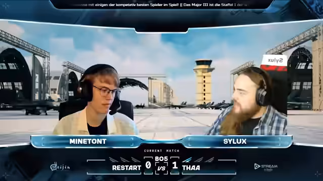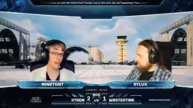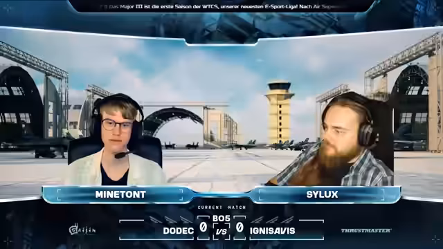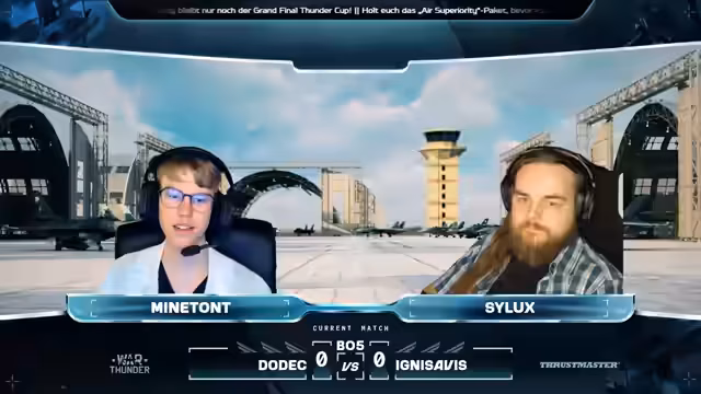 00:10:21Der zweite Tag der Qualifiers für die Air Superiority Major Training wurde gestartet. Der Streamer begrüßt die Zuschauer und stellt den Co-Moderator Cydux vor, der seit 2013 spielt. Die Aufstellung der ersten Teams wurde gezeigt, Restart gegen THAA. Die Match-Karte ist Bourbon Island. Es wurden die Sponsoren Thrustmaster und Stream by Hercules vorgestellt. Thrustmaster bietet Plug-and-Play-Lösungen und High-End-Produkte für Simulatoren, während Stream by Hercules sich auf Audio-Management für Streamer spezialisiert hat.