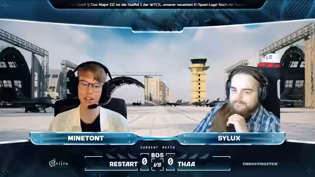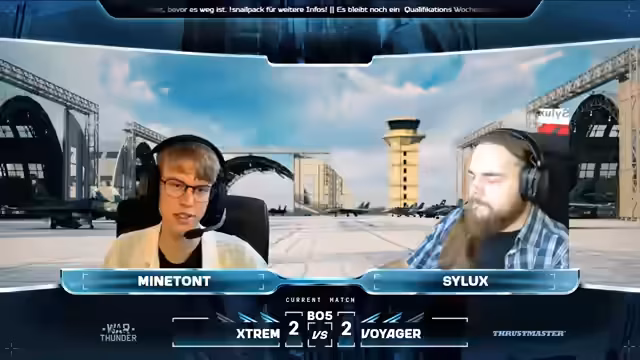00:10:21Der Stream beginnt mit einer herzlichen Begrüßung zum zweiten Tag der Qualifiers für SM Priority. Cydux, ein erfahrener Spieler seit 2013, wird als Co-Kommentator vorgestellt. Er ist hauptsächlich im Bereich Ground aktiv, hat aber auch Erfahrung mit Flugzeugen. Gemeinsam wird das Air Superiority Event kommentiert, bei dem ausschließlich Flugzeuge zum Einsatz kommen. Das erste Match ist Restart gegen THAA, wobei Restart ein französisches E-Sports-Team ist und THAA aus asiatischen Spielern besteht. Vor dem Match werden Trailer der Sponsoren Thrustmaster und Stream by Hercules gezeigt.