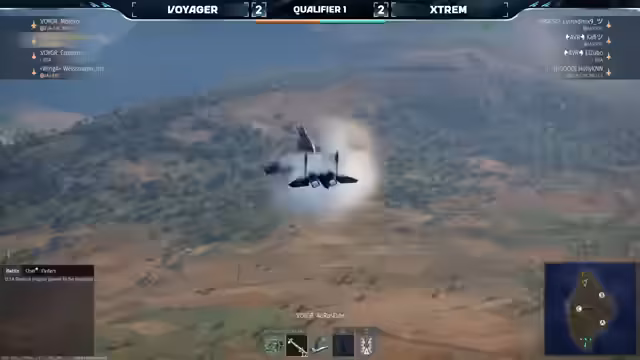 00:57:52El Zubo wird kurzzeitig unsichtbar, was für Erheiterung sorgt. Es kommt zu einem Dogfight zwischen El Zubo und Erchen, bei dem El Zubo die Maschinenkanone einsetzt. Nutmix und Holli von Extreme werden ausgeschaltet, sodass nur noch Al-Zubo und Kaffi gegen drei Spieler von Voyager übrig bleiben. R-73-Raketen werden im Nahkampf eingesetzt. Kaffi wird von Moloko im Head-on ausgeschaltet, womit Team Voyager (ehemals AVRVG) das Match gewinnt. Aures und Molokow erzielen die Abschüsse für Voyager. Die Taktik von Extreme, zwei Flugzeuge im Hintergrund zu halten, wird diskutiert, wobei vermutet wird, dass es möglicherweise ein Fehler war oder die F-18 defensiv Raketen abfeuern sollte.