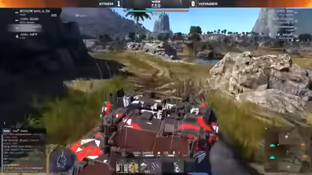 02:57:40Das Match beginnt mit intensiven, aber unkoordinierten Angriffen. Voyager, repräsentiert durch Nefow und Evil Wolf, startet aggressiv. Ein Raketenangriff von Evil Wolf verfehlt jedoch das Ziel und schlägt in den Boden ein. Nefow verfolgt eine andere Taktik, konzentriert sich aber auf die Maschinenkanone, was ihn in eine vorteilhafte Position bringt. Auch der Gegner versucht, mit Raketen anzugreifen, verfehlt aber, was den Kampf offen gestaltet.