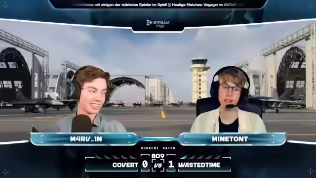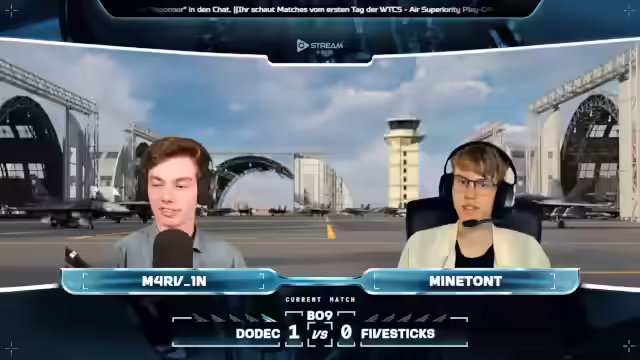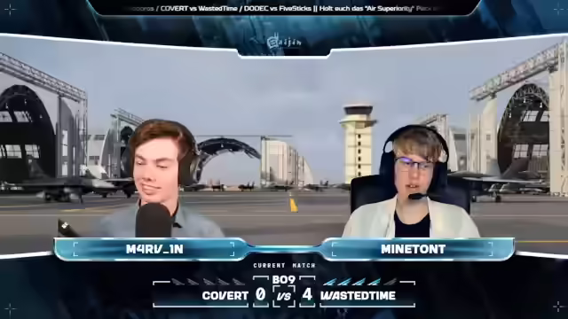 03:14:06Die Konsolenspieler Wing und Mark39 (Mark) sind mit der Su-27 im Einsatz. Es wird ein defensives Gameplay von Nick erwartet. Die anfängliche Split-Taktik der Teams ist gespiegelt, verteilt sich aber später etwas. Trotz möglicher technischer Schwierigkeiten wird der Respekt für die Konsolenspieler betont, die sich qualifiziert haben. Don Richard fliegt mit einer F-18 und beschießt Wasted Time. Team Covert kontrolliert den D-Punkt, was Wasted Time unter Zeitdruck setzt. Nick spielt defensiv, während Lastflat die Verteidigung durchbricht. Mark erzielt einen Kill mit einer R-77. Wasted Time gewinnt die erste Runde gegen Covert mit 4 zu 0 Kills. Es wird das Fuel Dampening Feature von Lars Blatt erwähnt. Tatsächlich keiner auf der Seite von Covert. Und vier Stück auf der Seite von Waste of Time. Einer von Pacific Fox. Tatsächlich zwei von Mark, dem Konsolspieler. Und noch einen weiteren von Nick.