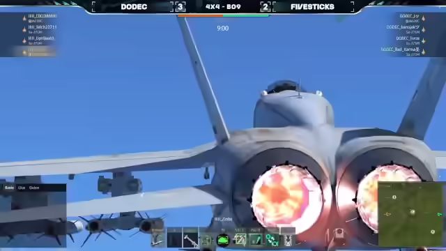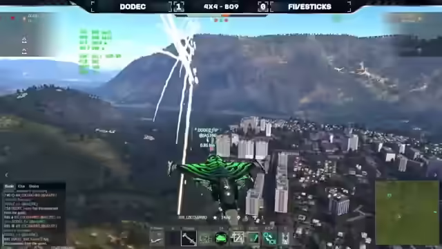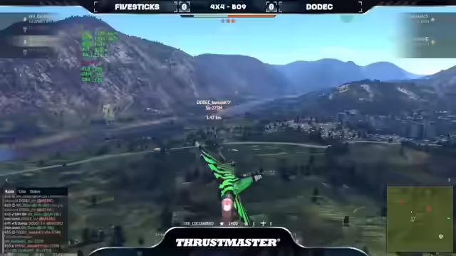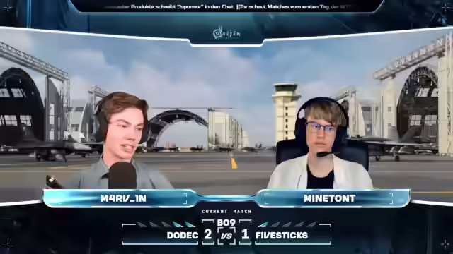04:25:18Das Match Dodek gegen Five Sticks startet auf Mysterious Valley. Dodek setzt auf eine Formation aus drei Su-27SMs und einer Gripen C, geflogen von Banu Jack, Jay, Bad Karma und Force. Five Sticks kontert mit einer Su-27SM, einer Su-20SM, einer F18C Mlu2 und einer Gripen, gesteuert von OPS-Bun, Telch, Sloba und Coco Jambo. Five Sticks pusht direkt den C-Punkt, während Dodek den Home Cap sichert. Die Map ist groß und bietet viel Deckung, was zu einem langsamen Spielbeginn führt. Five Sticks sichert sich den D-Punkt, Dodek den B-Punkt. Es folgt ein Katz-und-Maus-Spiel mit Raketen. Telch wird von Bad Karma ausgeschaltet, und Slowbar eliminiert ebenfalls ein Mitglied von Dodek. OPS-Bahn greift ein, während Banu Jack versucht, OPS auszuweichen. Jay erzielt kritische Treffer auf OPS-Bahn. Banu Jack entkommt Coco Jumbo mit dem Afterburner. Banu Jack schießt Coco Jumbo ab. Dodek gewinnt die Runde mit 1 zu 0. Coco, Drummond und Slova sichern sich Abschüsse für Five Sticks, während Banojack, Bad Karma und Jay für Dodek punkten. Die Teams positionieren sich lange, bevor es zu schnellen Aktionen kommt.