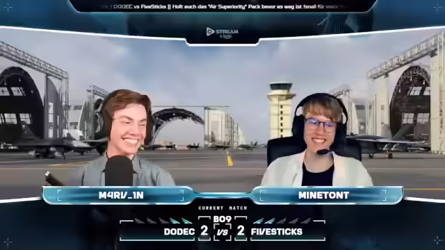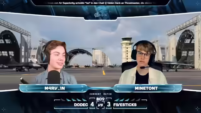 05:02:21Es wird auf die Active-Meta-Werbung unter dem Stream hingewiesen, inklusive Informationen zu YouTube-Kanal, eSport-Kisten, Thrustmaster, Hercules, Stream-Packs und Active-Meta. Team Dolek startet mit drei Su-27ern und Jay in seiner Gripen C, während Team Five Sticks mit zwei Su-27SM, einer Gripen von Coco Jumbo und Slubber in seiner FA-18C Mlu-2 antritt. Die Teams setzen auf einen Split, bei dem jeweils ein Spieler in Richtung Homecap fliegt. OPS-Bann, der Spieler mit dem höchsten RRB-Rating von Five Sticks, wird zum Homecap geschickt, was als ungewöhnliche Taktik angesehen wird. Es wird spekuliert, dass Dodek das Momentum nutzen könnte, während Five Sticks möglicherweise die Ausdauer fehlt. Die Zuschauer werden daran erinnert, dass sie Dodek für die lange Streamdauer danken können, die es ihnen ermöglicht, Drops zu erhalten. Ein Blick auf die morgigen Matches zeigt B1 mit A4 E-Sports gegen Ouroboros und Voyager gegen Extreme Team Voyager.