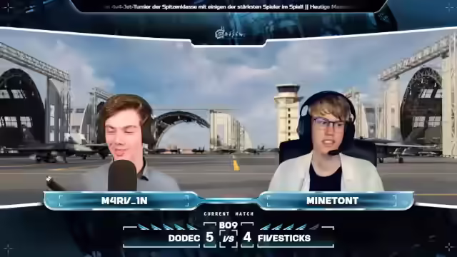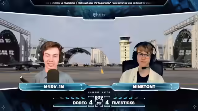 04:32:25Es wird ein Giveaway der japanischen F2A auf dem Discord angekündigt. Der Discord bietet auch Informationen zu Turnieren und die Möglichkeit, Teams zu finden. Es gibt einen Kalender mit allen anstehenden eSports-Events. Es wird nach einer Vorhersage gefragt, wer gewinnt. Beide Teams haben gute Chancen, aber Dodek ist erfahrener. OPS-Bahn von Five Sticks hat das höchste Rating in TSS-R. Es wird betont, dass Rating nicht alles ist, da es auf das Team ankommt. Die Taktiken auf Mysterious Valley sind entscheidend. Es gibt zwei Taktiken: mit oder ohne Home Cap. Der Rest wird zum C-Punkt geschickt. Team Dodek startet mit drei SU-27SM's und Jay in seiner Gripen C. Five Sticks geht wieder vollkommen mit auf den C-Punkt. Dodek holt sich mit einem Spieler den A-Punkt. Slova steigt mit der F-18 hoch und nimmt die Rolle des Höhenjägers ein. Es wird jeweils nur eine Gripen gespielt, währenddessen wird eher auf Jäger mit großer Raketenzuladung gesetzt.