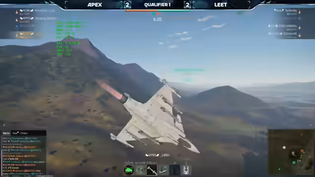 01:57:06Es wird ein Blick auf das Match zwischen Team Apex und Team Lead geworfen. Team Lead hat sich bereits für die letzten beiden WTCS-Turniere qualifiziert und liegt in der Gesamtwertung der Worcester Championship Series 2025 auf Platz 3, hinter DODEC und AVR Sport, aber noch vor Team Voyager. Im Match sehen wir auf Seiten von Apex 2 Su-27 und 2 Gripen, während Team Lead 2 F-18 und 2 Gripen einsetzt. Sanja wird beschossen, während Effekto das Torrent nutzt, um sicher zu bleiben. Die Ticketanzahl ist ausgeglichen, da jedes Team einen Cap kontrolliert. Fine-Apple-Pizza fliegt eine Su-27SM. Doom steckt Sanja in Brand. Sanja holt Kayun mit seiner Aim-9M raus. Ironic wird von einer F-18 beschossen, kann die Rakete aber abwehren. Kai-Hun holt Blumenhardt mit seiner Air-Darta raus. Stimmer wird von einer Rakete von Terfecto getroffen. Es steht 2 gegen 2. Fineapple Pizza holt sich den Kill an Terfecto mit der R73. Sanja wird von einer Rakete von Ironic getroffen und ausscheidet.
