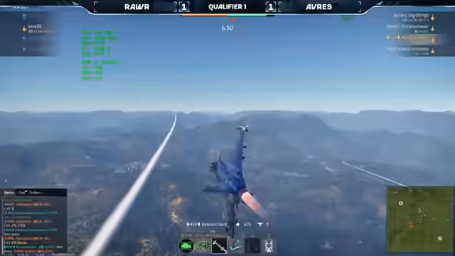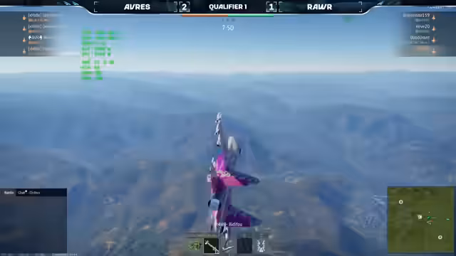 02:15:59Das Match zwischen Team Averys und Team Raw beginnt. Averys setzt auf eine F18, eine Su27 und zwei Grippens, während Raw zwei F18 und zwei Grippens ins Feld schickt. I Saw Your Runaway fliegt für Averys die Su-27, die maximal 12 Raketen tragen kann. Beide Teams bleiben geschlossen und konzentrieren sich auf den C-Punkt anstatt die Home Caps (A und B) einzunehmen. Ice Mario Runway nutzt seine Su-27, um aus großer Höhe Radarraketen abzufeuern. Waschbär übernimmt mit einer F-18 die Rolle des Raketenschützen aus der Distanz für Team Raw. Bisher ist noch kein Spieler in den Cap-Punkten angekommen. Bubenzito und Detra liefern sich ein Duell, das Bubenzito mit einer Elm 9M gewinnt. Isai Runway schießt Bubenzito mit einer R-77 ab. Der Bongo muss defensiv agieren und verliert einen Flügel. Auf Seiten von Team Raw sind nur noch Keep und BDFu am Leben, während Averys noch Little Bongo und Russian Shark hat. Team Averys dominiert das Spiel und hat kaum Tickets verloren, während Team Raw bereits die Hälfte der Tickets verloren hat.