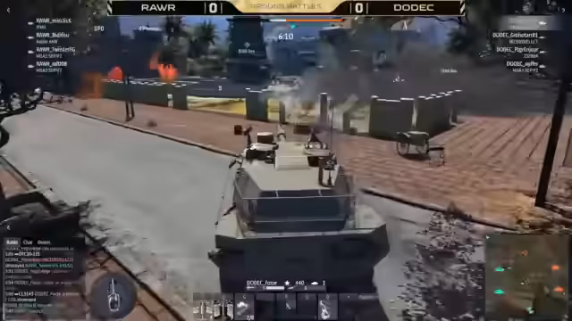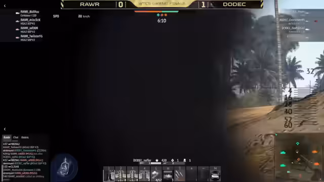 01:24:09Der Kampf um die Caps intensiviert sich. Twister zieht sich nach einem Treffer zurück und wirft Rauch, während Niffer durch den Rauch stößt, um ihn zu verfolgen. Trotz eines verfehlten Schusses sitzt der zweite Treffer und eliminiert Twister. Allerdings verlieren Panzergranate und Grotha gleichzeitig ihre Fahrzeuge und müssen von der ATU neu spawnen, was einen Rückschlag für DODEC bedeutet. RAW nutzt dies aus, um den B-Cap zu erobern und einen Ticket-Vorteil zu erzielen. Die Strategie von RAW ist es, den Ticket-Bleed aufrechtzuerhalten und den Charlie-Cap zu halten, um den Sieg über die Zeit zu sichern. Die Kommentatoren diskutieren, ob die Teams ihre passive Spielweise beibehalten oder doch noch aggressiver werden. Mistake von RAW gerät in eine gefährliche Position und wird von Grota mit einer Rakete ausgeschaltet. Dies führt dazu, dass B wahrscheinlich als nächstes fällt, es sei denn, RAW schickt neu gespawnte Panzer dorthin. Mistlik verliert ein weiteres Fahrzeug, und Team RAW ist nun stark dezimiert, wobei nur noch IPM Ones und Recon Raw übrig sind. Bidifu hält jedoch weiterhin den C-Cap, was als gute Leistung für den Scout des Teams gewertet wird. DODEC versucht, eine Zange um B zu schließen, wobei Twister in eine ungünstige Position gerät und sein IPM verliert. Niffer erleidet einen Breachdown, und Grota beschädigt die Kette eines Gegners.