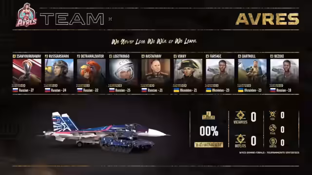 02:19:34Das Team Wasted Time wird vorgestellt, mit dem Motto „That's All Folks“. Zu den Spielern gehören Chefe Last Vlad (russischer Fahrzeugexperte, aggressiver Flugzeugpilot), Mark39 (Frontspieler, R- und Groundspieler), Nick (russischer Main, R- und Groundspieler), Irbis (aggressiver Spieler, russischer Reservespieler), Xali (ruhigerer Spieler, japanische Kampfkunst-Verfechter, tschechischer Main-Spieler) und Evolution (Ukrainer, Human Resource Manager, Tank Team Captain). Red Boys ist ein ausgeglichener Spieler. Das Team nutzt einen Skin der schweizerischen F-18 im deutschen Baum und den Typ 10 in Teamfarben. Es wird auf ein Künstlerinterview mit Lars Vlad auf Social Media und den eSport Discord hingewiesen. Anschließend wird das Team Averys vorgestellt, mit dem Motto „We never lose, we win or we learn“. Averys hat sich mit Team Hyde gemischt und Spieler wie I Saw You Runaway, Russian Shark, Tetra Malivator und Legit Bongo integriert. Vinny ist ein aggressiver Main-Tanker aus der Ukraine. Eyesore Runaway ist ein Main-Player und Content Creator. Russian Shark ist ein Luftfahrt-Enthusiast und Content Creator. Detramalivator ist ein professioneller Sim Racer und Rookie eSports Spieler. Legit Bongo ist ebenfalls Main-Pilot. Weitere Tanker sind Rastafari, Nexoxi und Farsage.
