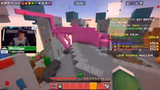 01:41:00Im weiteren Verlauf des Spiels werden multiple, hektische Gefechtssituationen geschildert, bei denen es auf schnelles Reagieren und Teamzusammenhalt ankommt. Spieler verlieren ihre Ausrüstung, sammeln neue Materialien wie Eisenrüstung und Pfeile und müssen gleichzeitig die Position der feindlichen Teams sowie der eigenen Kameraden im Blick behalten. Die Teammitzer organisieren sich, um gegnerische Spieler auszuschalten und gleichzeitig zu überleben.