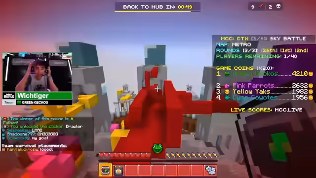 01:45:27Nach einem turbulenten Spielabschnitt wird der aktuelle Stand im Turnier präsentiert. Die Stimmung schlägt von Nervosität zu Euphorie um, als das Team sich auf Position drei im Gesamtranking verbessert. Die Spieler feiern diesen Erfolg massiv im Chat, rufen ihre Zuschauer auf, auf Twitter zu folgen und planen bereits die nächste Runde mit neuem Selbstbewusstsein.