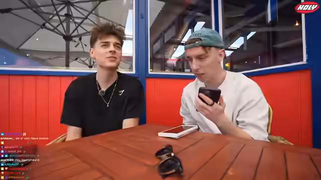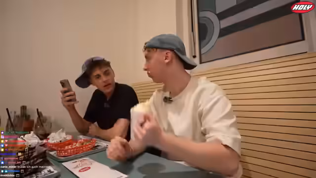 08:51:00Die Streamer sind weiterhin im Restaurant, fühlen sich aber von der Anwesenheit der Kamera beobachtet und gestört. Sie diskutieren das Essen, insbesondere einen angeblich kostenlos erhaltenen Burger, und stellen fest, dass das Personal auf einer anderen Etage ist. Eine Diskussion über ein Secret Dessert-Special entbrennt, welches jedoch auf der Karte nicht vermerkt ist.