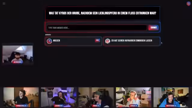 00:50:55Das Format des Quiz wird erklärt: Die Teilnehmenden erhalten Fragen, auf die man normalerweise keine Antwort weiß. Die Aufgabe besteht darin, eine möglichst realistische Antwort zu geben, um andere zu überzeugen, dass diese richtig ist. Es wird ein Beispiel gegeben, wie man bei der Frage nach der Anzahl von McDonald's-Filialen in Peking vorgehen könnte. Es gibt sowohl eine richtige Antwort, als auch die Möglichkeit, Punkte zu sammeln, indem man andere dazu bringt, die eigene Antwort zu wählen. Für die richtige Antwort gibt es einen Punkt, für jede Stimme für die eigene Antwort gibt es zwei Punkte. Der Streamer erklärt, dass es möglich ist, in den Modus hineinzuzoomen. Die erste Quizfrage wird gestellt: "Was tat Kyros der Große, nachdem sein Lieblingspferd in einem Fluss ertrunken war?" Die Teilnehmenden denken sich realistische Antworten aus.