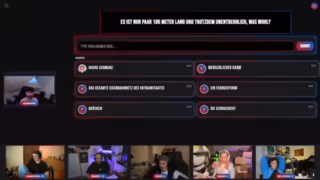 01:14:41Die nächste Quizrunde beginnt mit der Frage: Na klar, ein, eine Gestör ist. Die Teilnehmenden rätseln über die Bedeutung des Wortes Gestör. Es wird diskutiert, ob es sich um eine Vogelart handeln könnte. Die Antworten der Teilnehmenden sind vielfältig und reichen von einem Geschwür im Enddarm bis hin zu Teil eines Floßes. Die korrekte Antwort lautet Teil eines Floßes. Die nächste Frage lautet: Es ist nur paar hundert Meter lang und trotzdem unentbehrlich. Was wohl? Die Teilnehmenden überlegen, was unentbehrlich sein könnte. Als Antworten werden unter anderem Hugos Schwanz, menschlicher Darm, das gesamte Eisenbahnnetz des Vatikanstaates, ein Fernsehturm, Brücken und die Ozonschicht genannt. Die korrekte Antwort ist das gesamte Eisenbahnnetz des Vatikanstaates. Die nächste Frage lautet: Wer weiß, was ein, eine Stegodon ist? Der Streamer wählt als Antwort Archäologen.