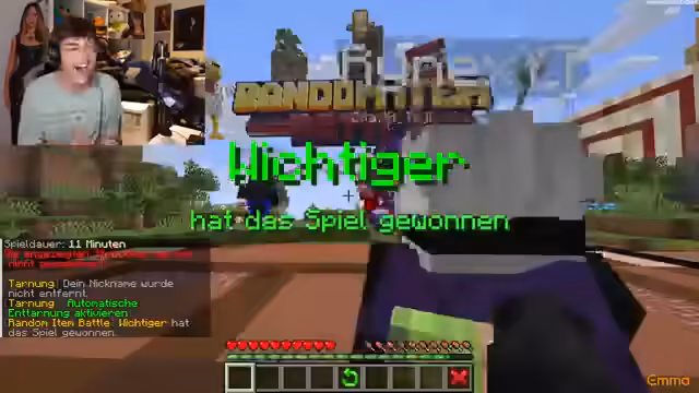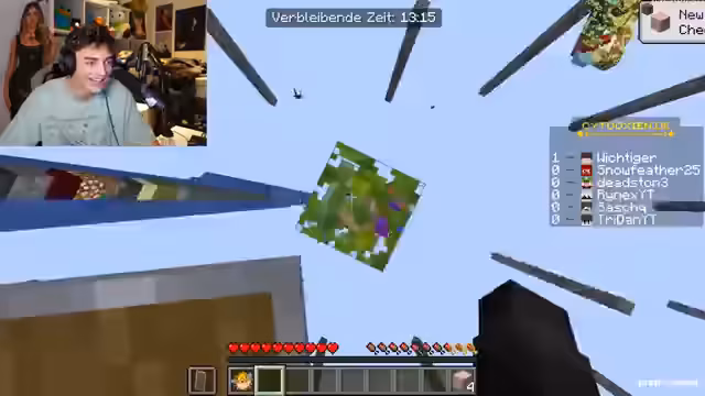 02:46:10Der Streamer wechselt zu einem Minecraft Random-Item-Battle-Modus. Er stellt die teilnehmenden Spieler vor: Lukas, Reinex, Sascha, Snow, Tridan und Zitachi. Es wird eine erste Runde auf einer Insel-Karte gestartet, in der die Spieler zufällige Items erhalten und kämpfen. Die Runde ist chaotisch, mit vielen Aktionen wie Elytra-Einsätzen, Invisibility-Potions und Kämpfen, die von Kommentaren und Emotionen begleitet werden.