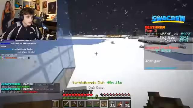 00:12:11Nach diversen kleineren Spielesessions und technischen Vorbereitungen beginnt das zentrale Event des Streams. Ein 100-Spieler-Minecraft-Deathrun auf dem Swag Crew Server wird gestartet. Entscheidende Regeln sind das Fehlen von Respawn, das aktive PvP und eine Schutzphase am Anfang. Der Streamer konfiguriert das Event, sorgt für eine Stabilität des Servers für die volle Spielerzahl und fordert alle Teilnehmer auf, sich auf der Startlinie zu versammeln, bevor die Stunde lange Laufphase beginnt.