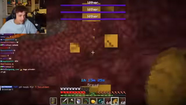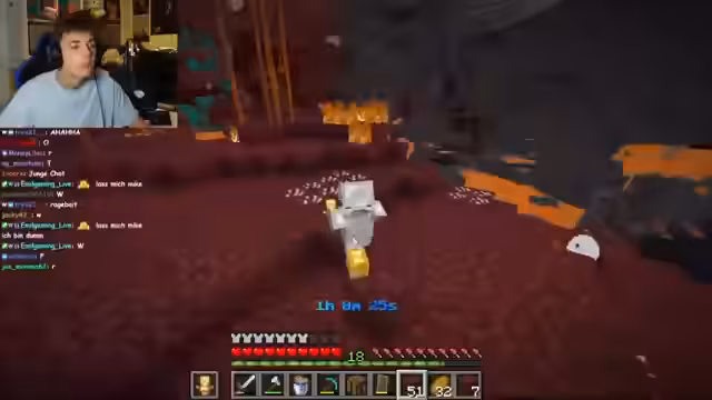 01:40:09Beide Spieler wagen sich in den Nether, um wertvolle Ressourcen wie Enderperlen und Blazeruten zu farmen. Der Streamer zeigt Geschick beim Navigieren durch die gefährliche Welt und hat multiple Englässe mit Monstern. Dabei werden auch Strategien für das Farmen von Blazespawns und Bastions diskutiert. Das Team koordiniert sich aktiv, um die gefährlichen Gebiete zu meistern.