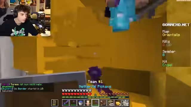 00:01:40Der Stream startet mit einem X3-Skyros-Turnier gegen die besten deutschen Minecraft-Spieler. Das Streamer-Teams mit Kenji und Simpli gegen 16 Top-Spieler. Es werden vier Skyros-Maps gespielt und bei Sieg folgt eine weitere Phase. Das erste Team ist Engel mit dem Fokus auf gute Loots und Ausrüstung.