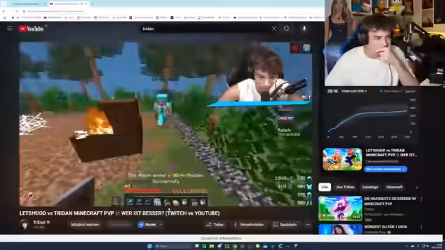 03:44:22Die Runde verläuft turbulent, der Streamer trifft auf einen Warden, mit dem er nicht interagieren kann. Es folgen gefährliche Situationen, ein Sturz und der Tod des Streamers. Er kritisiert Spielverhalten, bei dem Spieler ohne erkennbaren Loot in die Tiefe springen. Der Streamer spricht über geplante 1-gegen-1-Duelle mit Hugo und gibt an, ein neues Format für solche Duelle entwickelt zu haben, um Hugo zu provozieren.