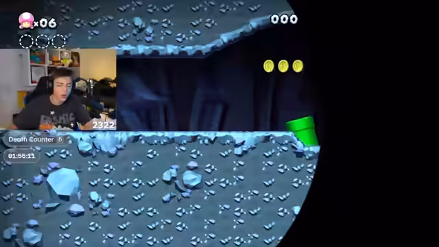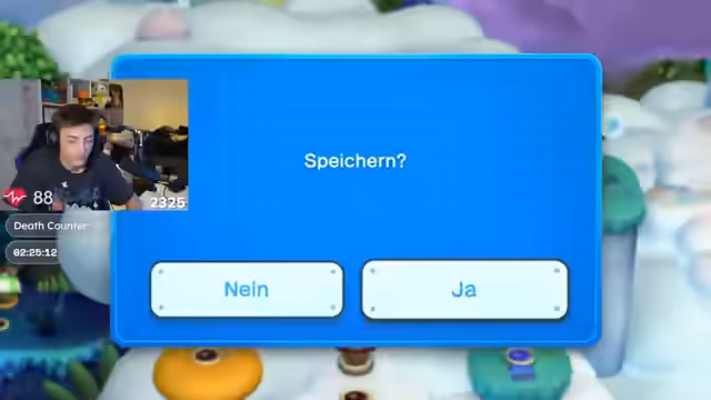 02:21:10Während des Spiels herrscht eine angespannte Atmosphäre. Der Streamer verliert beinahe sein 'Peach'-Power-Up und zeigt physische Anzeichen von Stress, wie einen erhöhten Puls von 105 Schlägen pro Minute. Er äußert seine Nervosität über den starken Druck, keinen Tod zu riskieren, und wird bei der Wahl der richtigen Route unsicher. Der Kollaps einer Plattform im Bowser-Level führt zu einem 'rage quit' aufgrund seiner ADHS.