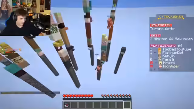 03:55:44Das Minecraft-Event startet bald. Es wird mit Voice-Chat gespielt, was das erste PvP-Streamer-Event dieser Art ist. Die Teilnehmer, wie Dimiax, Gustav und Fancy, spielen Runden in Sky Wars, Survival Games und Bad Wars. Es gibt keine Regeln, was Teaming und Allianzen erlaubt. Gewinner ist der letzte Spieler, der überlebt.