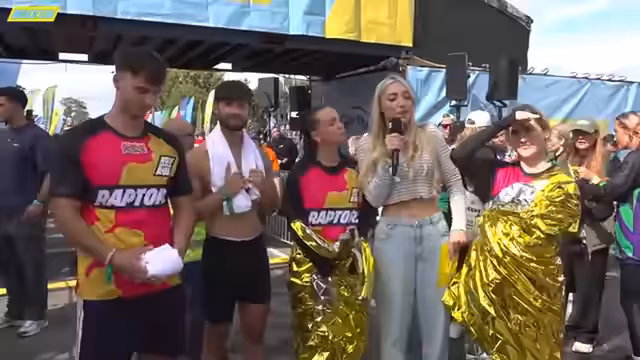 03:16:42Nach den ersten Creator-Teams erreichen langsam die Nachzügler das Ziel. Die Frogs werden mit 47 Minuten und 10 Sekunden als erstes Team im Ziel gefeiert. Sie werden mit Applaus und einer Belohnung begrüßt. Die Sharks sind als zweites Team im Ziel und sprechen über ihre Teamleistung. Der Kommentator lobt den Zusammenhalt und die sportliche Leistung der Teams.