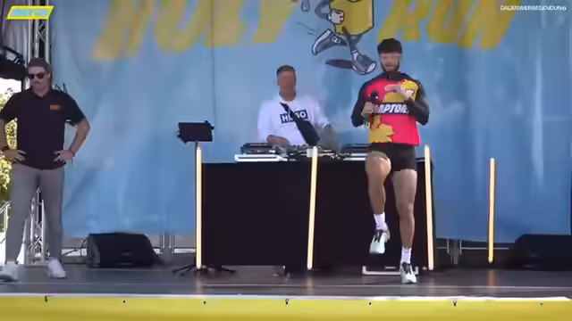 02:17:13Die Veranstaltung HOLY HOTFOOT RUN beginnt mit positiver Stimmung und äußerlich abgestimmten Teilnehmern. Das Wetter hat sich verbessert und die Sonne kommt heraus. Ein Warm-up mit Schradin und anderen Teilnehmern leitet den Event ein. Sportografen sind anwesend, um das Geschehen festzuhalten. Der Creator Jens Knossaller ist eingeladen und wird aufgefordert, Liegestütze zu demonstrieren, was eine humorvolle Interaktion auslöst.