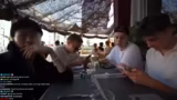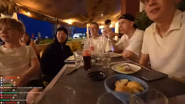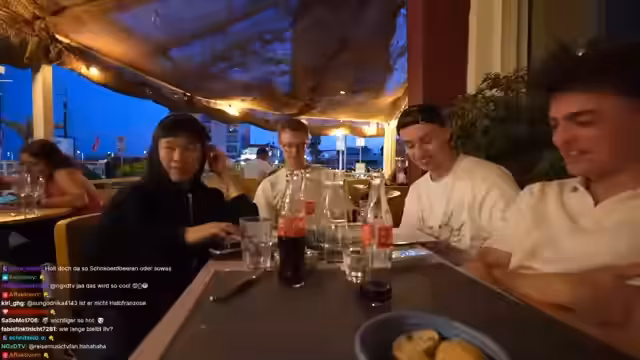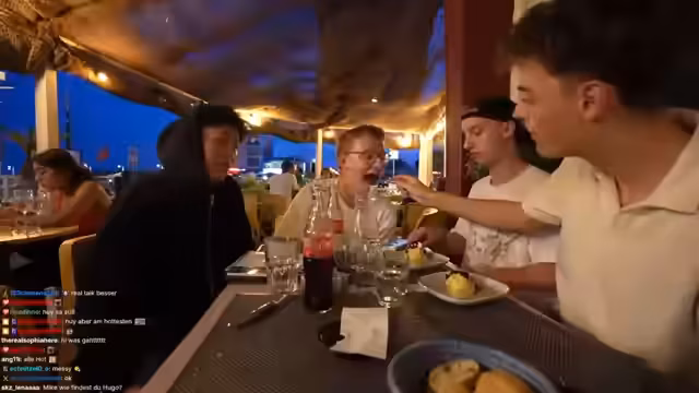 03:00:21Die Streamer besuchen ein Restaurant in Montpellier, haben aber Schwierigkeiten, einen Tisch für fünf Personen zu bekommen, da das Restaurant nur Platz für vier bietet. Stattdessen entscheiden sie sich, am Hafen zu sitzen und eine Pizza über Uber Eats zu bestellen. Unterhalten sich über das Wetter und die Temperaturen in Südfrankreich. Streamer Hugo kommt mit leckeren Cocktails und Gläsern, die als improvisierte Kameraunterstützung dienen.