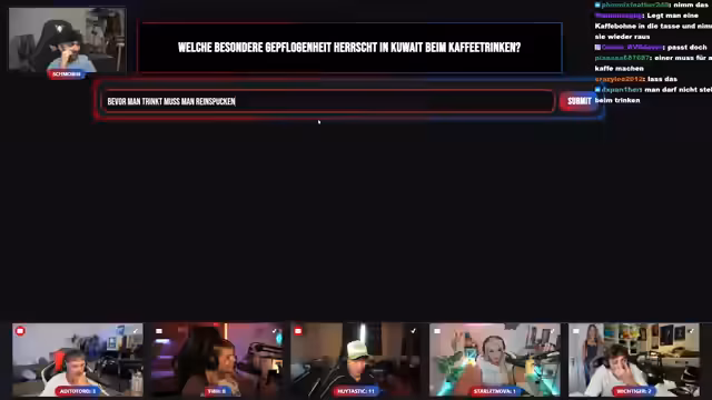 01:08:08Die Quizshow wendet sich einer kulturellen Tradition in Kuwait zu. Die Frage lautet, welche besondere Gepflogenheit beim Kaffeetrinken dort herrscht. Die Teilnehmer schlagen ungewöhnliche Bräuche vor, wie das Hinzufügen von Salz zur Kaffeetasse oder das Einspeucken in die Tasse vor dem Trinken. Nachdem alle Vorschläge gesammelt wurden, wird die richtige Antwort enthüllt: Der Kaffee wird lange nachgeschenkt, bis die leere Tasse leicht schüttelt. Dies führt zu einer weiteren Debatte über die Bedeutung und Herkunft dieser Tradition.