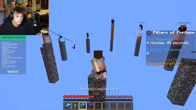 01:08:00Nach dem Reset beginnt die Challenge erneut mit Skywars, das erfolgreich absolviert wird. Es geht weiter mit Pillars of Fortune, wo Streamer zunächst große Anstrengungen zeigt, aber letztlich scheitert. Dies führt erneut zu einem Reset. Der Streamer wirkt trotz der Rückschläte entschlossen und spricht über seine Motivation, die Challenge trotz der Schwierigkeiten durchzuziehen. Gleichzeitig werden technische Probleme mit dem Headset erwähnt.
