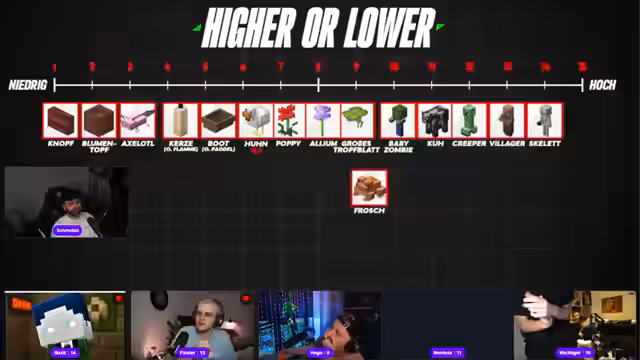 05:09:16Bei dieser Kategorie müssen die Teilnehmer verschiedene Minecraft-Objekte wie Hühner, Creeper, Knöpfe und Blumen nach ihrer Höhe oder Größe sortieren. Es entstehen hitzige Debatten über die korrekte Einordnung, insbesondere bei Objekten wie dem Knopf, dessen Position (am Boden oder an der Wand) die Höhe beeinflussen kann. Die Reihenfolge und die Positionen der Objekte werden heiß diskutiert, was zu falschen Platzierungen und emotionalen Reaktionen führt.