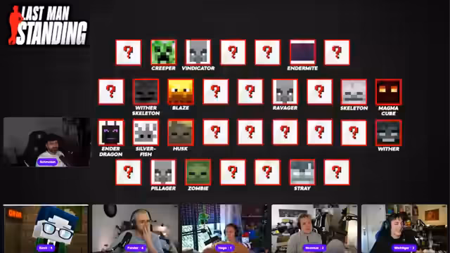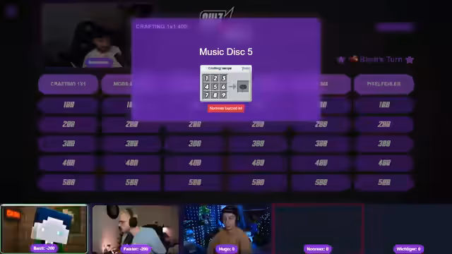 05:01:33Die nächste Kategorie konzentriert sich darauf, wie viele Sekunden bestimmte Blöcke wie Setzlinge, Glas oder Wolle in Minecraft von Hand abzubauen dauern. Die Teilnehmer sortieren die Blöcke nach ihrer Abbaudauer. Die Runde ist durch schnelle, aber manchmal unklare Entscheidungen geprägt. Technische Probleme und Lags führen zu Pannen und Verwirrung, besonders als Hugo und Wichtiger falsche Zuordnungen machen und dadurch ausscheiden.